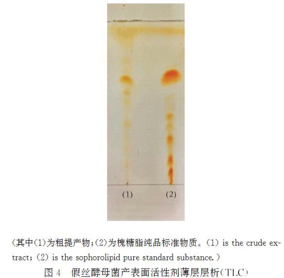 圖4假絲酵母菌產表面活性劑薄層層析(TLC)其中(1)為粗提產物;(2)為槐糖脂純品標準物質。