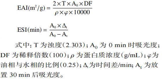 蛋清蛋白的乳化活性指數(emulsifying ability index,EAI)和乳化穩定性(emulsifying stability index,ESI)測定。制備不同pH(2.0、4.0、6.0、8.0、10.0)含1%(w/v)蛋清蛋白的溶液,取15 mL溶液與5 mL玉米油混合,在10000 r/min條件下高速均質1 min。分別在0、30 min時從離心管底部取50μL溶液,加入到4950μL 0.1%SDS溶液中,渦旋5 s混勻,立即在500 nm波長處測定吸光度。