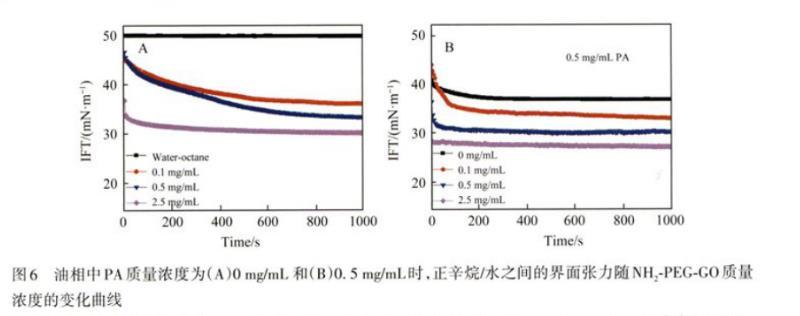 圖6油相中PA質量濃度為(A)0 mg/mL和(B)0.5 mg/mL時,正辛烷/水之間的界面張力隨NH2-PEG-GO質量濃度的變化曲線