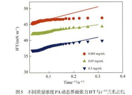 圖5不同質量濃度PA動態界面張力IFT與t-1/2關系曲線