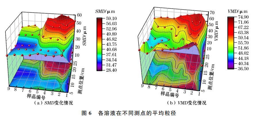 由圖7可知,各溶液平均粒徑和特征粒徑隨測點距離的增加呈現(xiàn)先減小后增大的趨勢。這是由于礦井水噴出后受到水泵壓力作用,不斷破碎成細小霧滴。隨著測點距離增加,水泵壓力對噴霧形成的促進作用逐漸減弱,此時礦井水表面張力對霧滴破裂的阻礙作用占據(jù)主導(dǎo)地位,霧滴平均粒徑和特征粒徑開始增大。此外,霧滴運動過程中,大粒徑霧滴凝并沉降和小粒徑霧滴蒸發(fā)消散也是出現(xiàn)這一現(xiàn)象的重要原因。