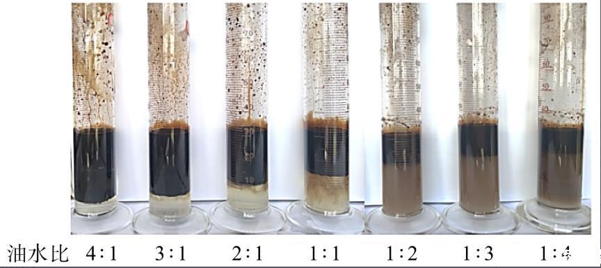 圖3為在45℃放置24 h后不同油水體積比條件下OBU-3低黏表面活性劑體系對(duì)油水的乳化情況。從圖3可看出,部分乳液分層嚴(yán)重,破乳效果較好。OBU-3對(duì)油水的乳化程度隨著油水體積比的增加而減小,油水體積比為4∶1、3∶1、2∶1、1∶1時(shí)分離出的水顏色較淺,油水分離效果較好。