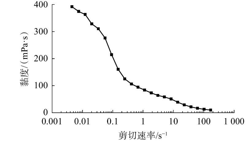 圖7為小段塞的黏度隨剪切速率的變化情況。從圖7可看出,體系黏度隨剪切速率的增加而快速降低,從392.8 mPa·s降至10.3 mPa·s。由于剪切力作用下纏結(jié)的自組裝超分子鏈打開(kāi)并發(fā)生取向,導(dǎo)致表面活性劑的黏度整體上隨著剪切速率的上升而下降。在低剪切頻率下黏度下降明顯,屬于典型的“非牛頓流體”,但當(dāng)剪切速率進(jìn)一步增大時(shí),黏度下降緩慢。
