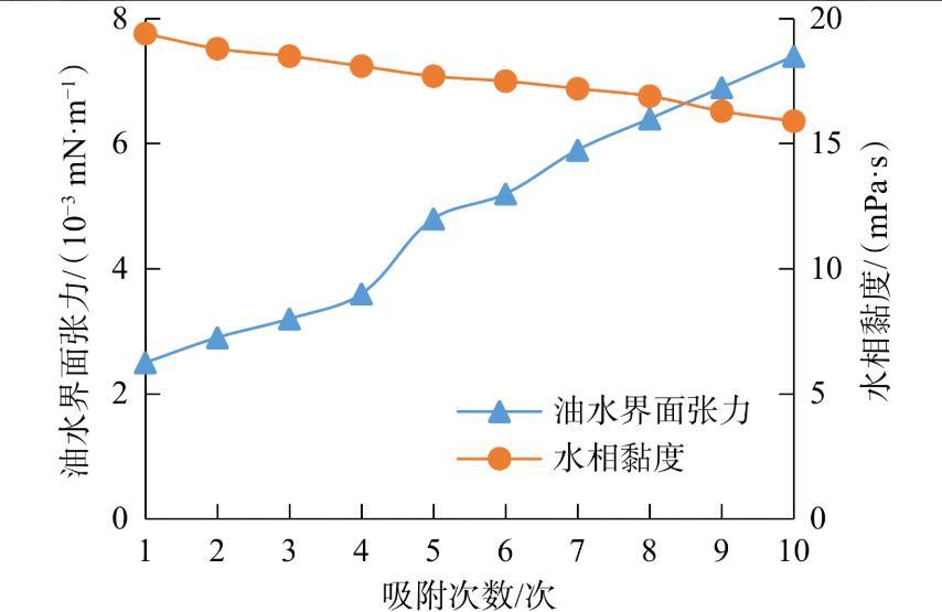 圖6吸附次數(shù)對(duì)ACS-2高黏表面活性劑體系的界面張力和水相黏度的影響
