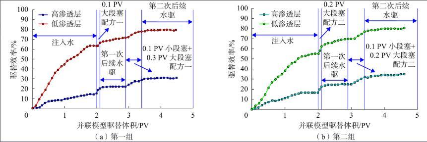 從表1可知,通過(guò)并聯(lián)天然巖心表面活性劑驅(qū)油實(shí)驗(yàn)發(fā)現(xiàn),只用大段塞驅(qū)平均提高采收率7.4個(gè)百分點(diǎn),非常低。而采用組合段塞進(jìn)行調(diào)和驅(qū),第一組組合段塞驅(qū)在高低滲層分別提高驅(qū)油效率10.1個(gè)百分點(diǎn)和17.7個(gè)百分點(diǎn)。第二組組合段塞驅(qū)在高低滲層分別提高原油采收率10.2個(gè)百分點(diǎn)和16.1個(gè)百分點(diǎn),兩組組合段塞驅(qū)平均提高采收率為14.8個(gè)百分點(diǎn),比只用大段塞驅(qū)平均采收率提高了1倍,達(dá)到了聚/表二驅(qū)的驅(qū)油效果。