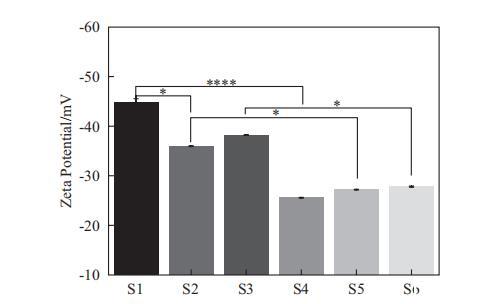 在我們的研究中,測量了Zeta電位,如圖6所示。對于SLES體系(S1-S3),S1表現(xiàn)出最負的Zeta電位,其次是S3,而S2的Zeta電位最小。對于SMCT體系(S4-S6),它們之間的Zeta電位沒有顯著差異。比較SLES和SMCT體系時,可以觀察到SMCT體系的Zeta電位低于SLES體系。此外,在S1和S4、S2和S5以及S3和S6之間發(fā)現(xiàn)了顯著差異。