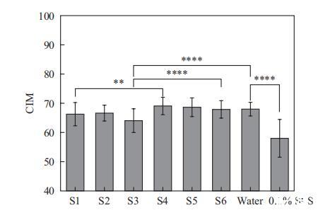 這里我們使用這種方法評估了6種表面活性劑復合物的溫和性。如圖5所示,SMCT體系(S4-S6)的CIM值與水的CIM值相當,并且顯著高于SLES體系(S1-S3)。這表明SMCT體系表現(xiàn)出優(yōu)異的溫和性,對皮膚脂質(zhì)屏障的破壞潛力低于SLES體系。對于SLES體系,引入非離子表面活性劑導致S2(含APG)的CIM略有變化,但S3(含海藻糖脂)的CIM顯著降低。類似地,對于SMCT體系,加入APG(S5)和海藻糖脂(S6)后,CIM值顯著低于S4。這表明加入海藻糖脂對兩種體系的溫和性都有影響,意味著皮膚脂質(zhì)提取能力增強。然而,這一結(jié)果與上述體外細胞測試中IL-1a測試的結(jié)果相矛盾。這種差異可能是由于兩種方法的作用機制不同。角質(zhì)層表面測量法主要反映表面活性劑對皮膚脂質(zhì)屏障的破壞,而細胞測試中的IL-1a與細胞反應相關(guān)。但細胞不像皮膚那樣擁有脂質(zhì)屏障。