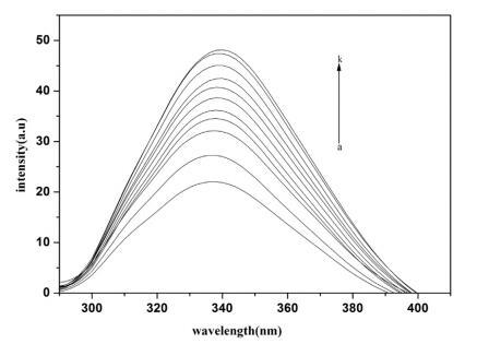 圖 3. 不存在和存在 16-E2-16 時 Hb (5 μM) 的熒光光譜。 這 16-E2-16 (ak) 的濃度為 0, 0.39, 0.76, 1.13, 1.48, 1.81, 2.14, 2.45, 2.75, 3.05 和 3.33 μM。