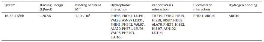 Hb 中的 α 和 β 鏈具有相似的結(jié)構(gòu)折疊, 由七個連續(xù)的α-螺旋和兩條鏈組成 包含由螺旋 4 和 5 包圍的間隙結(jié)合袋,而空腔的底部由 C 端部分形成 螺旋 6 和螺旋 7 的 N 端片段 [69]。 16-E2-16為主 Hb 與中央空腔、α1 和 β2 鏈結(jié)合(圖 6A)。 這 該結(jié)合位點(diǎn)上的氨基酸殘基包括 Thr39, α1 中的 Tyr42、Phe43、Pro44、His45、His58、His87、Leu91、Val93、Asn97 鏈和 Leu31、Arg40、Phe41、Phe42、His63、Val67、Ala70、Phe71、 His92, Leu96, His 97, Val98, Asn102, Phe103, Leu106, Leu141 in β2 鏈圖 6B。 有超過 20 個氨基酸殘基位于 16-E2-16 的站點(diǎn),這意味著它們之間的強(qiáng)相互作用 16-E2-16 和 Hb [70]。 疏水性和靜電力作用 在 16-E2-16 與 Hb 的結(jié)合中起重要作用,這個結(jié)果是 與我們的實(shí)驗(yàn)結(jié)果一致。 然而,范德瓦爾斯 力量不容忽視。 已觀察到一個氫鍵 在 16-E2-16/Hb 相互作用中的 16-E2-O 原子 具有 β2 鏈 ARG40 的 16 個分子(圖 6C)。 的形成 氫鍵穩(wěn)定 16-E2-16/Hb 復(fù)合物。 的類型 相互作用和參與相互作用的氨基酸殘基 以表格形式顯示(表 3)。