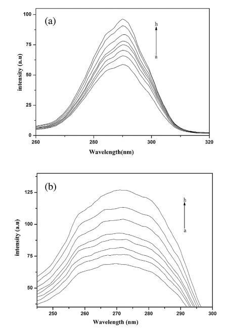 圖 4. Hb (5 μM) 的同步熒光光譜。 (a) α∫= 20 nm (b) ? = 80 納米。 16-E2-16(ah)的濃度分別為0、0.39、0.76、1.13、1.48、1.81、 2.14 和 2.45,μM。