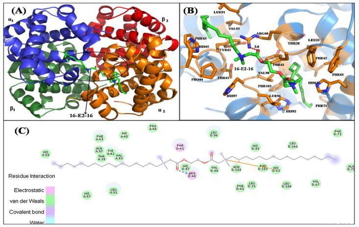 圖 6. 具有 16-E2-16 的 Hb 結(jié)構(gòu)示意圖。 (A) Hb-16-E2-16 的結(jié)構(gòu)。 Hb 的亞單位用不同的顏色表示。 配體 16-E2-16 是 以棍子為代表。 (B) 距停靠的 16-E2-16(綠色)5? 范圍內(nèi) Hb 的周圍氨基酸殘基(橙色)。 (C) Hb/16-E2-16 相互作用的二維表示。 (為了 對圖例中顏色參考的解釋,讀者可參考本文的網(wǎng)絡(luò)版本。)