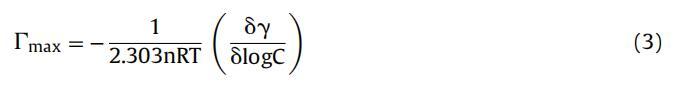 最大表面過量 (∫max) 表示為每單位面積界面處的表面活性劑分子濃度。 表面張力數(shù)據(jù)用于計算表面過量 應(yīng)用吉布斯吸附等溫線的濃度 (∫max) 方程: