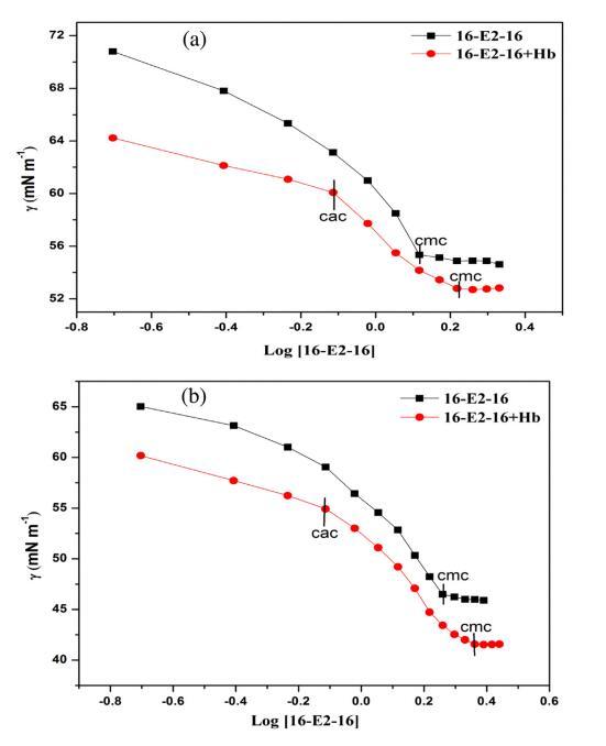 表面張力測量用于研究 關(guān)于 16-E2-16/Hb 相互作用的定性信息 空氣/水界面。 圖 1 顯示了 16-E2-16 分布的表面張力與對數(shù)濃度在不存在和 在不同溫度下存在 Hb (5 μM)。 斷點(diǎn) 表面張力與表面活性劑濃度對數(shù)的關(guān)系 不同溫度下純表面活性劑的文件對應(yīng) 到相應(yīng)溫度下表面活性劑的 cmc。 這 16-E2-16/Hb體系的表面張力曲線呈現(xiàn)兩個斷裂 點(diǎn),第一個斷點(diǎn)對應(yīng)臨界聚合 濃度(cac)代表表面活性劑的開始 蛋白質(zhì)結(jié)合而作為第二個斷點(diǎn)對應(yīng)于 在 Hb 存在下 16-E2-16 的 cmc。 16-E2-16 的 cmc 在不同溫度下不存在和存在 Hb 的情況下 列在表 1 中。從這些值可以看出,16-E2-16 的 cmc 隨著 Hb 的存在和溫度升高而增加。 在 Hb 存在下 cmc 的增加證實(shí)了 16-E2-16/Hb 復(fù)合物的形成,在此期間一些單體 與 Hb 結(jié)合,因此無法形成膠束 進(jìn)而導(dǎo)致膠束化延遲 [54]。 表1還 表明 cmc 值隨溫度升高而增加 這意味著疏水力的參與,它們是 溫度依賴,在 cmc 的蛋白質(zhì)表面活性劑相互作用中。 這可以歸因于 16-E2-的溶解度增加 16 單體隨溫度變化而抑制膠束化。 此外,較高的溫度有利于熱運(yùn)動,這會導(dǎo)致 更多的分子與 Hb 結(jié)合。 但是,cac 保持不變 在所有溫度下。 因此,我們可以認(rèn)為 16-E2-16 與 Hb 結(jié)合 通過 cac 附近的靜電相互作用,因?yàn)殪o電 相互作用不受溫度影響。 此后,作為 表面活性劑濃度增加,蛋白質(zhì)通過疏水力與表面活性劑相互作用。 下表面張力值 Hb-16-E2-16系統(tǒng)比對應(yīng)的16-E2-16系統(tǒng)是 由于 Hb 的高表面活性。