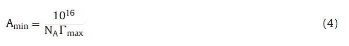其中 γ 是表面活性劑濃度 C 下的平衡表面張力 (mNm?1),n 是每分子的粒子數(shù) 表面活性劑。 由于表面活性劑的解離導(dǎo)致三種物質(zhì)的形成,公式 1111 表示在低于 cmc 的恒定溫度下 γ 與 log[16-E2-16] 之間的曲線斜率。 ∫max 值允許計算 每個分子 Amin 的最小表面積(以 nm2 為單位) 方程: