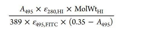 熒光光譜法用于選擇含有FITC-HI的小份樣品。 FITC探針在494nm激發(fā)時(shí)顯示出517nm的發(fā)射。 人們注意到,當(dāng)探針與HI共軛時(shí),F(xiàn)ITC發(fā)射的強(qiáng)度增加。 吸收光譜法用于確定HI與FITC的比率,該比率由下式計(jì)算得出。21