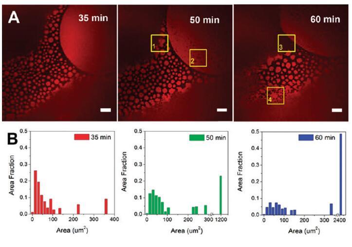 圖5。蛋白質(zhì)島隨時間的聚合。(A)導(dǎo)入后35、50和60分鐘拍攝的共焦熒光圖像。比例尺:20μm.(B)蛋白質(zhì)島大小分布的直方圖。初始亞期濃度為[HSA-TR]=0.50 mg/mL和[F-127]=0.015 mg/mL。ROI-1表示一個區(qū)域(黃色框),其中小的蛋白質(zhì)島與周圍的蛋白質(zhì)島結(jié)合形成一個較大的島;ROI-2表明該區(qū)域形成了小黑洞;ROI-3表示在表面活性劑富集區(qū)域的邊界處的運(yùn)動;ROI-4顯示了小的蛋白質(zhì)島合并成網(wǎng)狀網(wǎng)絡(luò)的地方。