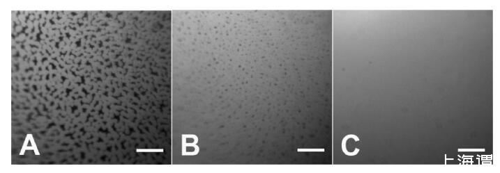 圖3。顯示異質(zhì)結(jié)構(gòu)域轉(zhuǎn)變?yōu)橥|(zhì)層的熒光圖像。C(HSA-TR)=PBS中的0.01 mg/mL,pH值7.2,離子強(qiáng)度=530 mM。(A)3、(B)8和(C)將蛋白質(zhì)溶液引入試驗箱后36分鐘。標(biāo)尺:50μm。