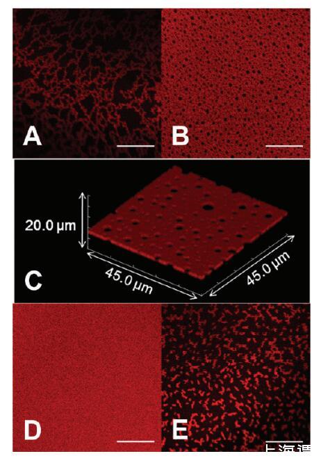 圖2。蛋白質(zhì)組裝的形態(tài),隨離子強(qiáng)度和還原劑的添加而變化。HSATR(0.01 mg/mL)在(A,B)PBS中的AWI下自組裝,pH值7.2,離子強(qiáng)度=53 mM和(C)在掃描體積為45.0*45.0*20.0μm3的情況下,呈現(xiàn)了與圖像B相同的溶液條件對應(yīng)的共焦圖像Z疊層。(D)PBS,pH值7.2,離子強(qiáng)度=530 mM。(E)30 mM DTT,pH 7.2,離子強(qiáng)度=53 mM的PBS。比例尺:20μm。