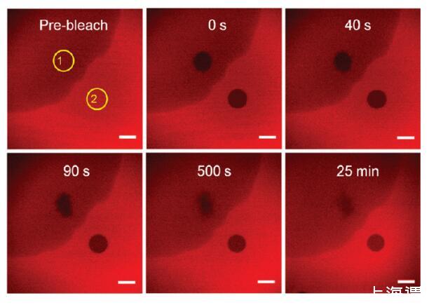 圖4。界面層光漂白后的熒光恢復(fù)。ROI(黃色圓圈)是選定的光漂白區(qū)域。ROI-1位于富含表面活性劑的區(qū)域,而ROI-2位于富含HSA TR的區(qū)域。初始亞相濃度為[HSA-TR]=0.10 mg/mL和[F-127]=0.0050 mg/mL。比例尺:20μm。