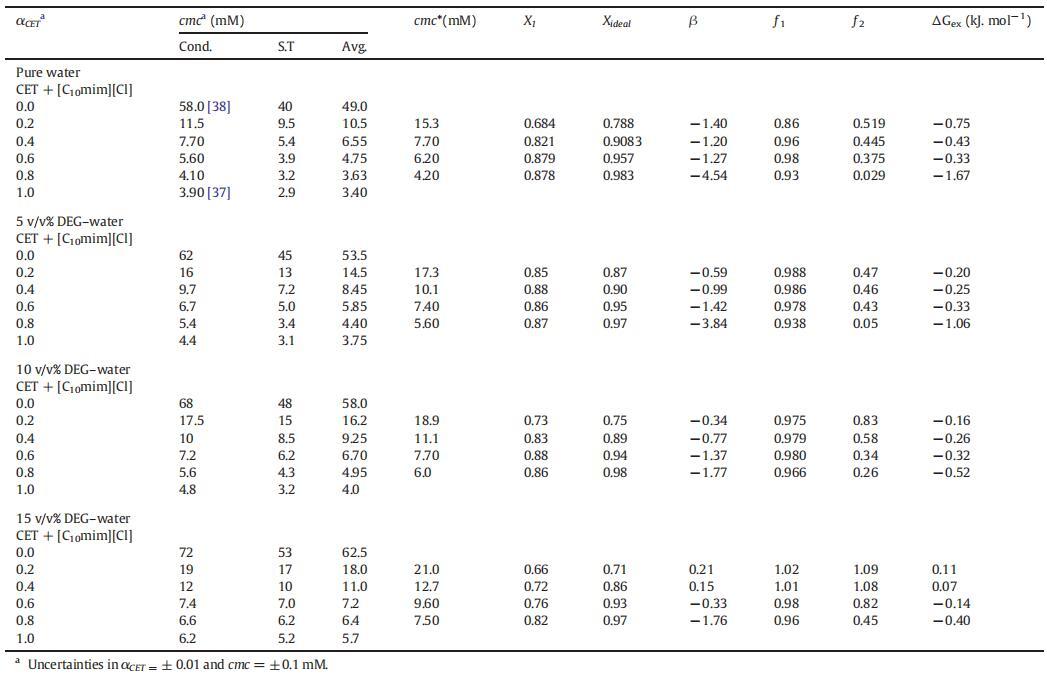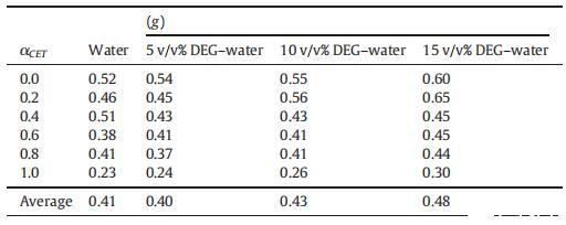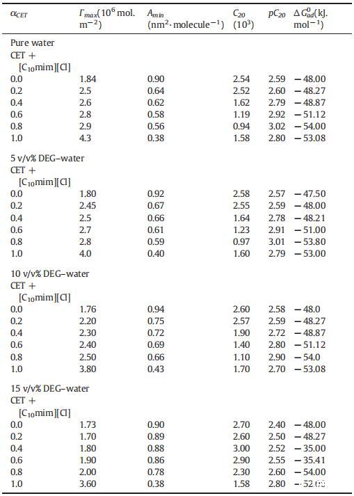 表4純CET、[C10min][Cl]和CET+[C10min][Cl]混合物的表面過剩(Γmax)、每分子最小面積(Amin)、吸附效率(pC20)和吸附自由能(ΔGad 0),作為純水中CET摩爾分?jǐn)?shù)α的函數(shù),并且在T=298.15K時存在不同體積百分比的二元DEG-水混合物。