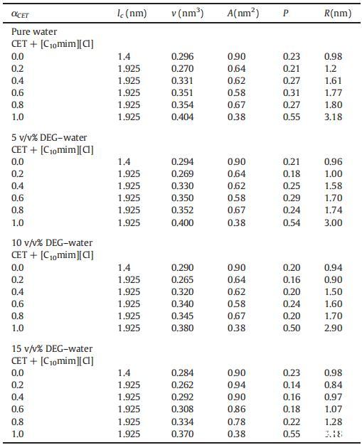 表5在純水中以及在T=298.15 K下存在不同體積百分比的DEG+水二元混合物時,純CET、[C10min][Cl]和混合物CET+[C10min][Cl]的有效疏水鏈長度(lc)、疏水鏈體積(v)、極性頭基團(tuán)表面積(A)、填充參數(shù)(P)和半徑(R)的值。