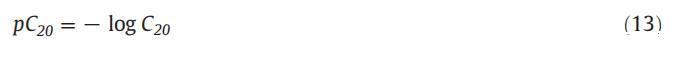 為了計算吸附效率,重要的是要知道產(chǎn)生最大吸附量的兩親分子的摩爾濃度。最大吸附量出現(xiàn)在表面張力降低到20mn·m時?1[64]和C20是該點(diǎn)的摩爾濃度。用pC20表示的兩親分子的吸附效率如下所示: