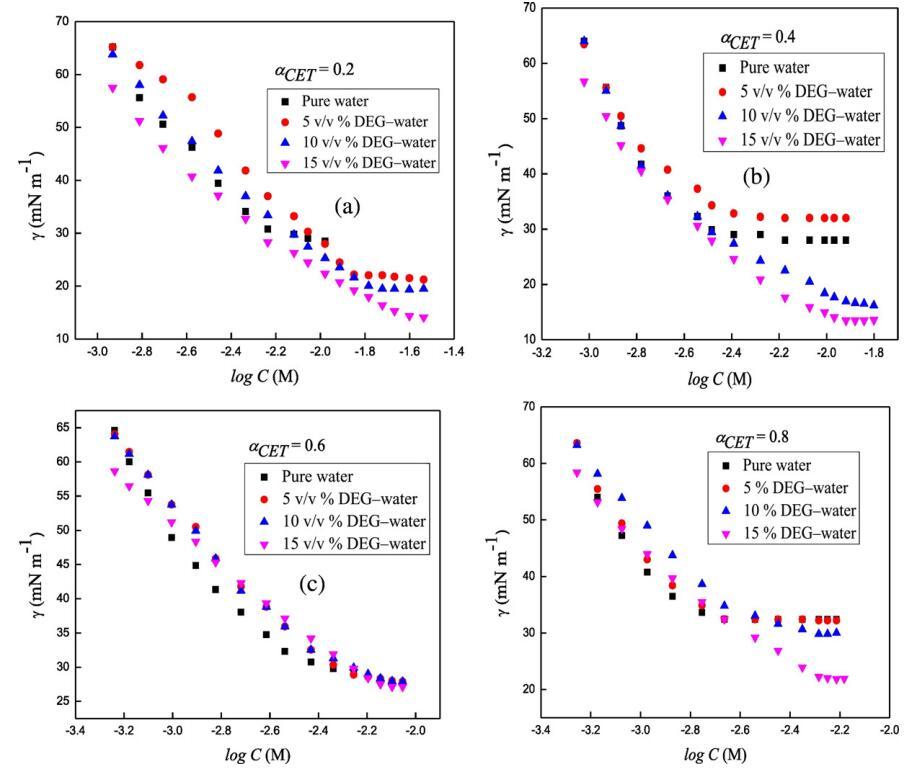 圖2.在T=298.15 K時,二甘醇-水二元混合物的不同體積百分比下,混合體系的表面張力,γ與對數(shù)[濃度]的關(guān)系曲線,CET+[C10min][Cl](a)αCET=0.2(b)αCET=0.4,(c)αCET=0.6和(d)αCET=0.8。