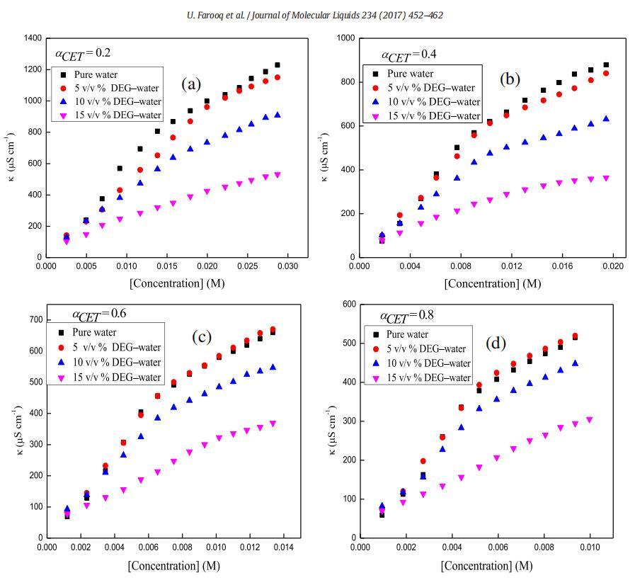 圖1。在T=298.15 K時,二甘醇-水二元混合物的不同體積百分比下,混合體系的比電導(dǎo)率,κ與[濃度]的曲線圖,CET+[C10min][Cl](a)αCET=0.2(b)αCET=0.4(c)αCET=0.6和(d)αCET=0.8。