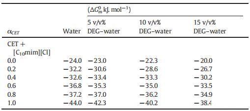 從表2中可以清楚地看出,g值并不遵循特定的趨勢,但是隨著DEG在混合系統(tǒng)中的體積百分比的增加,其g值以某種方式增加,這種增加可能是因為膠束的表面電荷密度降低,這是由于膠束聚集數(shù)減少所致。水和DEG-水二元混合物中CET、[C10min][Cl]和CET+[C10min][Cl]混合膠束的標(biāo)準(zhǔn)吉布斯自由能(ΔGm0)值如表3所示。如表3所示,隨著二甘醇與水的體積百分比的增加,膠束化過程變得不那么自發(fā)。