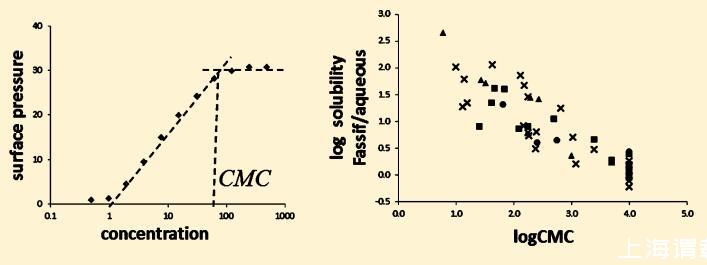 表面張力由一種成熟的體外測定法測定,該測定法通過測量化合物的臨界膠束濃度和兩親性來評估化合物的表面活性劑性質。 兩親性是用于量化化合物與生物膜親和力的一個關鍵屬性,在制藥工業(yè)中廣泛用于預測藥物誘導的磷脂病,11,12 ? 腦屏障滲透,13和藥物淋巴吸收。 14在這項工作中,我們同樣評估了化合物對生物相關介質中所含膠束的親和力是否可以用化合物固有的表面活性劑性質來解釋。 因此,我們對不同化合物的表面活性劑性質進行了表征,以將此類表面活性性質與FaSSIF中觀察到的與水介質溶解度相比的溶解度增強程度相關聯(lián)。 共分析了51個分子,包括上市藥物和羅氏專利化合物,具有廣泛的溶解性、親脂性和電離狀態(tài)。