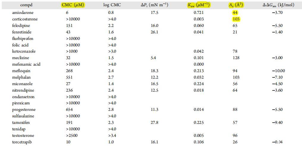表面活性測定?;衔镌贒MSO中連續稀釋超過12種不同濃度,并在pH值為6.5的0.05 M磷酸鹽緩沖液中添加至最終10%的DMSO含量。最終化合物濃度默認范圍為10 nM至10 mM。在第二次實驗中,對于達到溶解度極限或需要對相關濃度范圍進行解析以確定最佳參數的情況,定義了替代濃度范圍。樣品靜置10分鐘,以便在液體中平衡?空中接口。表面壓力分布在張力計(MultiPi WS1,Kibron Inc.,芬蘭赫爾辛基)上進行,通過之前的測量(72.8 mN/m)對50μL等份樣品進行校準。通過對生成的等溫線進行曲線擬合確定表面活性參數,并根據經典的空氣吉布斯熱力學理論進行計算?水里,臉上。主要導出參數如下。(i)考:空氣?水分配系數,來自等式2