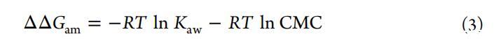 式中,π對應于表面壓力,C對應于化合物濃度。(ii)CMC:對應于最大表面壓力下平臺截距和曲線外推斜率的臨界膠束濃度(?π/?lnc)處于拐點(圖3)。(iii)ΔΔGam:式3中的兩親性