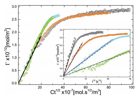 圖5吸附量(G)作為產(chǎn)品Ct1/2的函數(shù)。插圖顯示了不同體積濃度的微凝膠顆粒的G與t1/2的單獨(dú)曲線:(>)0.10 G l-1,(D)0.20 G l-1,(,)0.50 G l-1,(B)1.00 G l-1。實(shí)線是直線擬合,虛線是使用D=DDL計算的坡度繪制的。