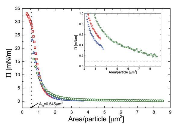壓力-面積等溫線是通過在Langmuir槽上對擴(kuò)散單分子膜進(jìn)行3組不同實(shí)驗得到的。這些等溫線中的面積坐標(biāo)根據(jù)吸附在界面上的顆粒數(shù)量進(jìn)行縮放。如圖1所示,所有曲線都折疊到一個圖上。在增加壓縮時,壓力最初略有變化,但低于2 mm2/顆粒時,壓力急劇增加。曲線的斜率首先增加,但在約27 mN m-1處達(dá)到最大值,在此有一個拐點(diǎn),然后是一個稍弱的斜率。如圖1中的虛線所示,對應(yīng)于該拐點(diǎn)的每粒子面積(Ac)值為0.545 mm2。假設(shè)粒子緊密堆積,這對應(yīng)于~835 nm的粒子間距離,遠(yuǎn)大于在本體溶液中測量的粒子流體動力學(xué)直徑(590 nm),表明粒子確實(shí)發(fā)生了實(shí)質(zhì)性變形。如圖1的插圖所示,0.5 mN m-1級的有限表面壓力(即遠(yuǎn)高于我們的檢測極限0.1 mN m-1)實(shí)際上已經(jīng)可以在約4 mm2的每粒子面積上測量。插圖還表明,在兩個不同的朗繆爾槽上進(jìn)行的不同實(shí)驗之間,P的絕對值在0.3 mN m-1范圍內(nèi)可重復(fù)。