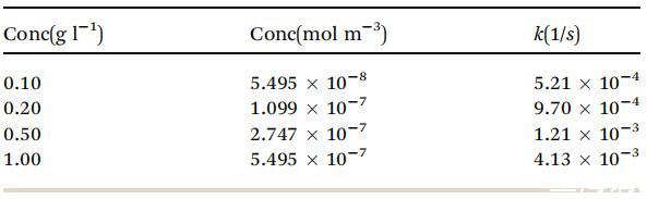 表2根據(jù)圖6中的實(shí)驗曲線計算的各種濃度的速率常數(shù)k(1/s)值