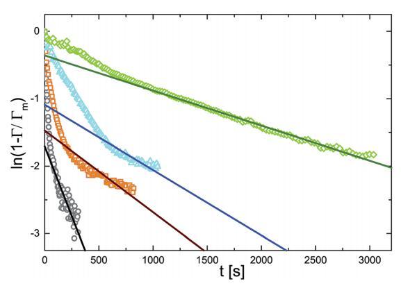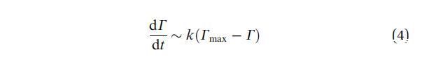當(dāng)系統(tǒng)接近飽和時,G(t)的下降速度必須隨著表面變得擁擠而減慢。吸附質(zhì)濃度剛好低于表面,然后與吸附物種失去平衡,動力學(xué)受到吸附屏障的限制。一級動力學(xué)過程會導(dǎo)致: