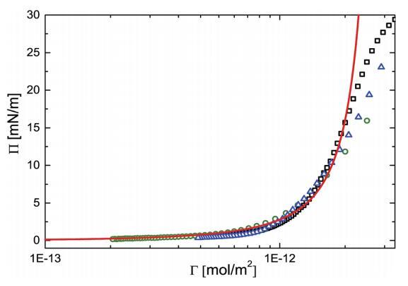 圖2表面壓力(P)與空氣-水界面上PNIPAM顆粒吸附量(G)的關(guān)系。開放符號表示與三組不同實(shí)驗相對應(yīng)的實(shí)驗數(shù)據(jù)點(diǎn),即:(,)具有高初始顆粒負(fù)荷的NIMA槽,(B)具有低初始顆粒負(fù)荷的NIMA槽和(D)具有高初始顆粒負(fù)荷的Kibron m槽。紅色實(shí)線表示使用Groot和Stoyanov模型進(jìn)行的預(yù)測。