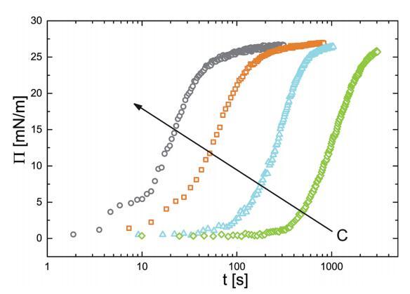 在建立了一個狀態(tài)方程來關(guān)聯(lián)表面壓力和吸附量之后,我們現(xiàn)在開始研究粒子的吸附動力學(xué)。為此,我們監(jiān)測了PNIPAM顆粒懸浮液中新制備氣泡的界面張力隨時間的變化。我們將界面張力值轉(zhuǎn)換為表面壓力。結(jié)果如圖4所示。表面壓力值最初迅速增加,然后放松到最終平衡值。動力學(xué)可以清楚地分為兩個獨(dú)立的時間尺度:一個是表面壓力值增加表示的初始快速動力學(xué),另一個是系統(tǒng)向最終平衡狀態(tài)松弛時的緩慢部分。短時間快速動力學(xué)和長時間慢得多動力學(xué)之間的區(qū)別是許多表面活性材料吸附行為的特征。32,33