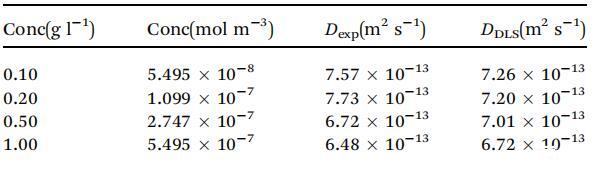表1根據(jù)實(shí)驗G與t1/2曲線計算的不同濃度的擴(kuò)散系數(shù)D(m2 s-1)值與使用DLS測量的值相比