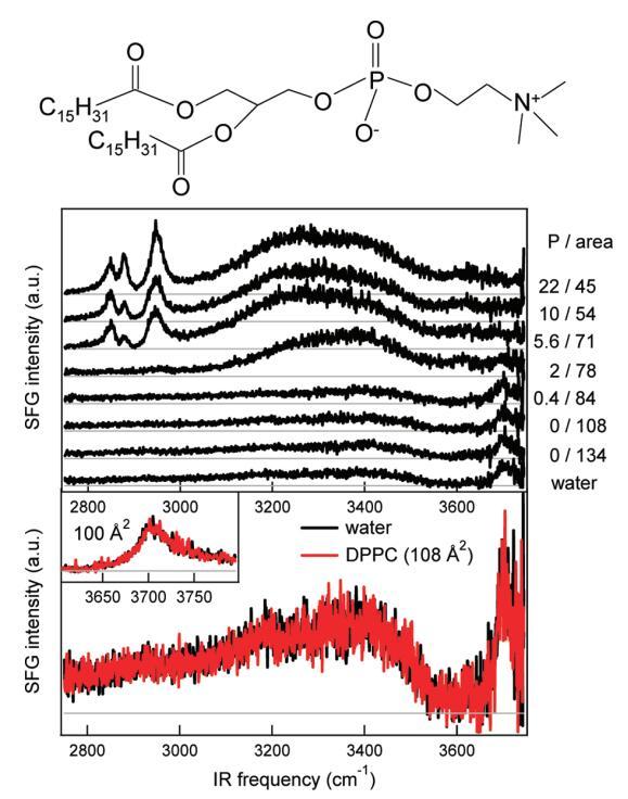 圖1。頂板:DPPC的分子結構。中間面板:裸露水面(底部光譜)和密度增加的水中DPPC的SSP極化SFG光譜。壓力(mN/m)和每個分子的面積(?2)分別從底部到頂部增加和減少,在圖表旁邊給出。每個分子的面積由氯仿溶液滴的數量控制。CH(2800)?3000厘米?1),氫鍵OH(3000?3600厘米?1),還有免費的哦(~3705厘米?1)拉伸振動可見。底部面板:從裸露水面的中間面板放大,每個分子的DPPC為108?2,以表明它們的相似性。插圖放大了裸露水面和DPPC(100?2)表面的自由OH拉伸振動區域。在每個分子的這個區域,壓力仍然低于檢測極限,表面上DPPC的存在顯然不影響自由OH拉伸振動的振幅。相對較高的紅外通量(~10 mJ/cm2)用于本實驗。