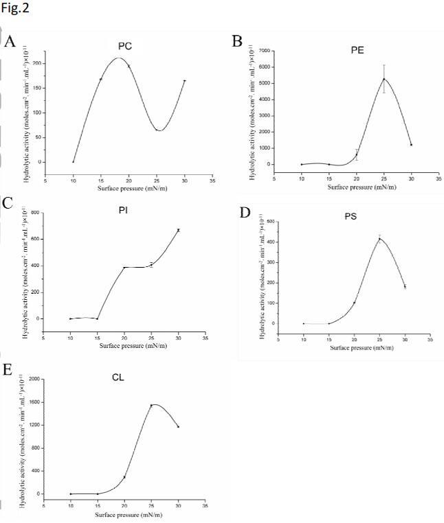 圖2示出了使用各種磷脂作為水解底物獲得的詳細活性-表面壓力曲線。可以看出,酶的水解活性高度依賴于表面壓力。然而,每種底物的活性曲線不同。發現基板PE、PS和CL的鐘形曲線具有特征性的最佳表面壓力值(圖2B、D、E)。在低于15 mN/m的表面壓力下,未檢測到基本酶活性。水解活性隨表面壓力的增加而增加。在25 mN/m的表面壓力下,觀察到PE、PS和CL的最大活性。然而,當表面壓力高于25 mN/m時,所有這些磷脂的水解活性降低。與所有測試的底物相比,在25 mN/m的表面壓力下,PE的水解率最高,水解活性達到5272.31×10-11摩爾。cm-2。最小-1。mL-1。對于PI,在15 mN/m以下也沒有觀察到水解速率,但是,沒有觀察到鐘形曲線,并且隨著表面壓力從15 mN/m增加到30 mN/m,活性增強(圖2C)。對于PC,從10 mN/m到25 mN/m觀察到鐘形曲線,但在30 mN/m的表面壓力下,活性進一步增加。隨著表面壓力從25 mN/m增加到30 mN/m,表面輪廓上的單層構象可能發生了變化,導致活性增加。在本實驗中,在測試的表面壓力范圍內,SM沒有活性。從π-A曲線可以看出,在25 mN/m的表面壓力下測試的所有磷脂都處于液態冷凝狀態,沒有達到各自的坍塌壓力。在這種情況下,超卵磷脂酶對不同單分子磷脂膜的偏好順序為PE>CL>PS>PI>PC。在這些條件下,SM沒有活性。Lecitase Ultra選擇性的詳細機制仍需闡明。