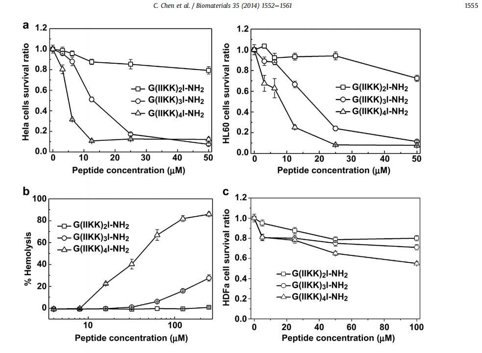開發(fā)對(duì)宿主細(xì)胞具有良好生物相容性但對(duì)癌細(xì)胞具有高效力的功能性生物材料和藥物是一項(xiàng)具有挑戰(zhàn)性的工作。通過利用天然抗菌肽和a-螺旋蛋白的優(yōu)勢(shì)特性,我們?cè)O(shè)計(jì)了一類新的短a-螺旋肽G(IIKK)nI-NH2(n細(xì)胞)。我們表明,含有?n1e4的肽具有不同的效力和對(duì)癌癥?3和4的高選擇性,能夠有效殺死癌細(xì)胞,同時(shí)在其工作濃度下對(duì)宿主細(xì)胞保持良性,通過類似于殺菌效果的機(jī)械過程。細(xì)胞的高選擇性可能源于它們優(yōu)先與帶有負(fù)電荷和高流動(dòng)性的細(xì)胞外膜結(jié)合。除了快速透膜能力外,這些肽還可以通過線粒體途徑和死亡受體途徑誘導(dǎo)癌細(xì)胞的程序性細(xì)胞死亡,而不會(huì)誘導(dǎo)非特異性免疫原性反應(yīng)。重要的是,這些肽還可以在小鼠異種移植模型中抑制腫瘤生長(zhǎng),而不會(huì)引起副作用。雖然這項(xiàng)研究揭示了這些肽作為強(qiáng)效藥物和其他醫(yī)療保健應(yīng)用的臨床潛力,但它也指出了基礎(chǔ)材料研究在高選擇性肽功能材料未來發(fā)展中的重要性。
