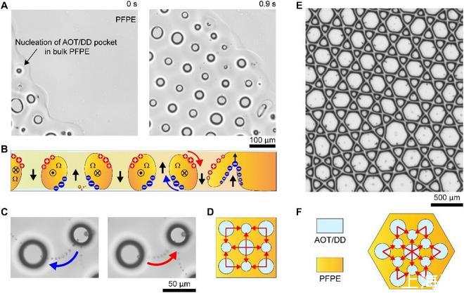 在這項(xiàng)研究中,團(tuán)隊(duì)將油與多種具有不同介電常數(shù)和電導(dǎo)率的液體混合后,通過(guò)施加電場(chǎng),界面發(fā)生剪切,會(huì)脫離平衡狀態(tài),產(chǎn)生有趣的結(jié)構(gòu)。液滴形成了許多出乎意料的圖案,可被控制成為方形或六邊形,每條邊都是筆直的,這在自然界中幾乎是不可能的。