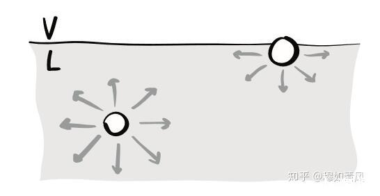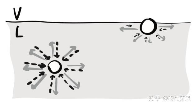 以表示液體內部分子對它的吸引力,遠遠大于液面上蒸氣分子對于它的吸引力,即合力指向液體內部。于是,看起來表面張力好像是垂直于液體表面的。
