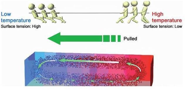在兩種液體相互接觸的時候,表面張力強的液體會將表面張力弱的液體拉過來,這股力會將表面張力弱的液體反向倒吸進表面張力強的液體之中,科學(xué)家將這一現(xiàn)象命名為馬拉高尼效應(yīng)。導(dǎo)致這一現(xiàn)象發(fā)生的條件有很多,比如液體的濃度含量,溫度的高低都會讓兩種液體產(chǎn)生馬拉高尼效應(yīng)。