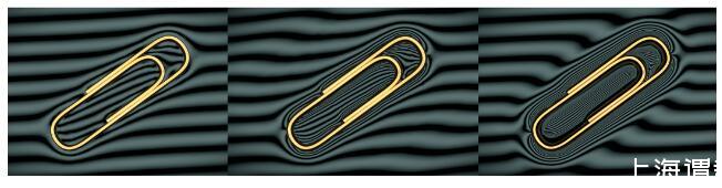 在這個(gè)例子中我們成功使密度大于水的回形針漂浮在水面上,水面下面的條狀背景會(huì)因?yàn)樗娴膹澢冃危瑥淖蟮接一匦吾樀拿芏戎饾u增大,中間條紋的密度也在逐漸增加。在最右邊的場(chǎng)景中,回形針的密度達(dá)到了7.9 g/cm^3(金屬鐵的密度),是水密度的將近8倍,但是依然可以依靠表面張力漂浮起來(lái),得到的條紋分布與真實(shí)圖片最為接近。
