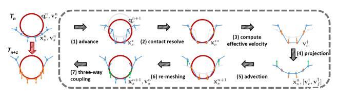 我們的耦合系統(tǒng)分為三個(gè)部分:流體,表面層,固體。流體部分我們采用傳統(tǒng)的歐拉網(wǎng)格的模擬方法,在交錯(cuò)網(wǎng)格(Staggered Grid)上用算符分離的方法求解離散不可壓的Navier Stokes方程。固體部分采用傳統(tǒng)的拉格朗日方法求解牛頓方程。我們的主要貢獻(xiàn)在于在流體與固體之間插入了一層有質(zhì)量、有厚度的流體表面層,這個(gè)表面層直接對(duì)應(yīng)我們上面介紹的流體表面分子稀疏的部分。因?yàn)檫@個(gè)表面層非常薄,我們可以使用帶虛擬厚度的單層三角網(wǎng)格來(lái)表示,然后在這個(gè)表面層上施加表面張力勢(shì)能。為了將這三個(gè)部分耦合起來(lái),我們?cè)诒砻鎸雍捅尘熬W(wǎng)格、固體和背景網(wǎng)格之間定義了速度的插值矩陣,同時(shí)將流體的壓強(qiáng)作用在表面層和固體上,以及將表面張力作用在固體上,這樣我們將這三部分寫(xiě)進(jìn)一個(gè)三相耦合方程里進(jìn)行統(tǒng)一求解和更新。最終我們算法的流程如下: