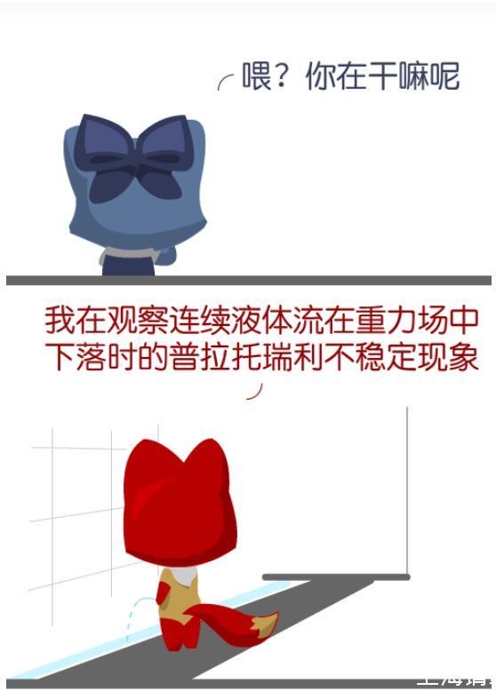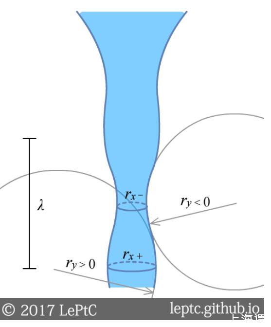 這一現象稱為普拉托-瑞利不穩定性(Plateau–Rayleigh instability)。我們在柱狀界面上加一個波長為λ的擾動,橫截面上的曲率變化rx是促進柱的分裂的,但縱截面上ry的曲率變化會阻礙分裂,后者的效應隨λ變長而減弱。