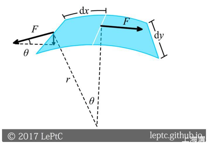 假設膜在x的方向彎曲,曲率半徑為r,作用在一個微小的長度dy上的表面張力F=σdy,sinθ≈dx/r,指向球內的合力為Fsinθ=σdxdy/r(沒有乘2是因為每條邊的力被相鄰兩個面元共用),這一力由壓強差平衡,除以面積dxdy得壓強差為σ/r。對于球面x和y方向都彎,故球內壓強比球外大2σ/r(對于肥皂泡因為有兩層界面還要再乘2)。