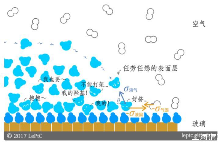 在氣體和液體之外,現在我們再加入新的角色——固體表面。玻璃的表面對水分子非常有吸引力(雖然玻璃的主要成分是二氧化硅,但它的表面通常會因為價態不飽和而結合很多羥基)。如果水滴碰到的界面是玻璃,就會出現跟空氣相反的情況:接觸面的水分子比平衡時更擠,表面張力是擴張的,表面能是負的,整坨水滴會希望自己跟玻璃的接觸面積越大越好(同時跟空氣接觸面積越小越好),形成特定的接觸角θ。這個角越小,意味著固體表面的親水性越強。